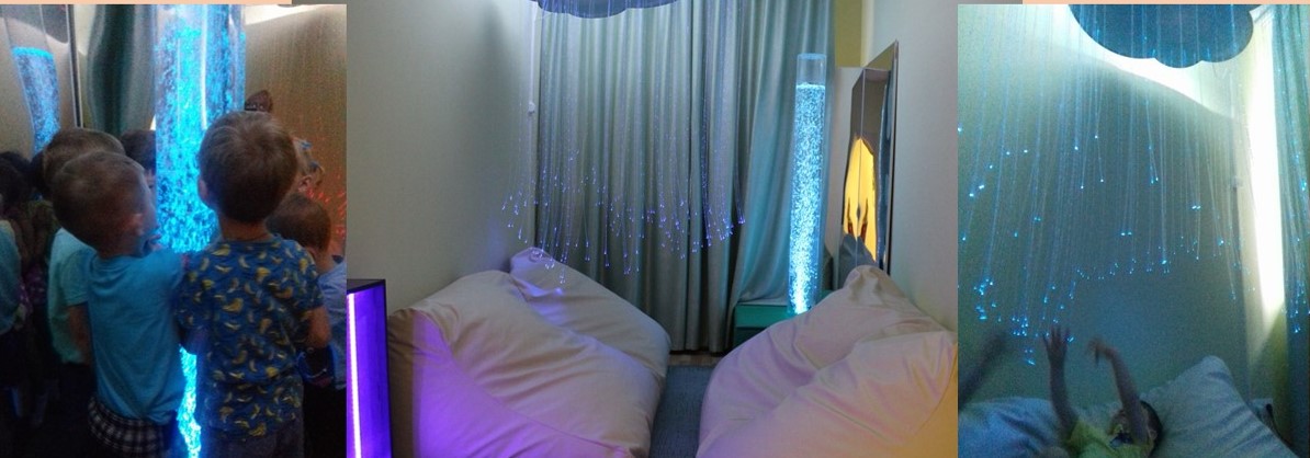 | панель интерактивная «Дождь», ·панель светозвуковая «Бесконечный тоннель», ·интерактивное пособие «Тучка» с пучком светооптических волокон, ·интерактивная воздушно-пузырьковая трубка с подсветкой ·мягкие пуфики |